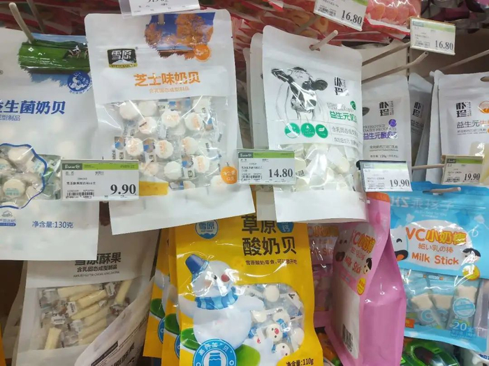 而在线下实体店,奶片早已和零食放在一起售卖。在朝阳区的一家连锁超市内记者看到,奶片产品和糖果、巧克力被摆放在同一排货架上。工作人员告诉记者,目前该超市的奶片产品有10余种,销售情况还不错,有几款奶片产品销量非常可观,而主要消费人群为家里有孩子的消费者。“销量还不错,最近一直在稳定增长,奶片主要是作为零食销售的,父母买给孩子当零食的比较多。”这种说法很快得到了印证,在另一家大型超市内,记者看到消费者李女士正在给孩子挑选奶片产品,李女士告诉记者:“这种奶片挺小的,有好多口味,还有一些营养价值。挺适合给孩子吃,我感觉比薯片、饼干这种零食要好一点。”