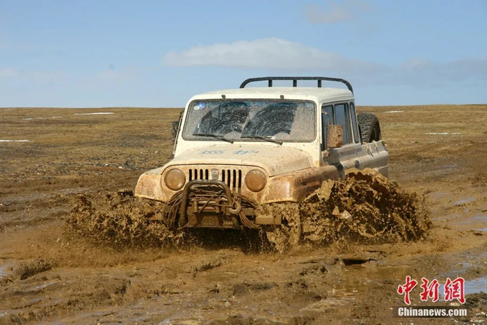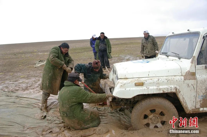泥泞难行的道路,巡护车陷入泥沙中 赵凛松 摄