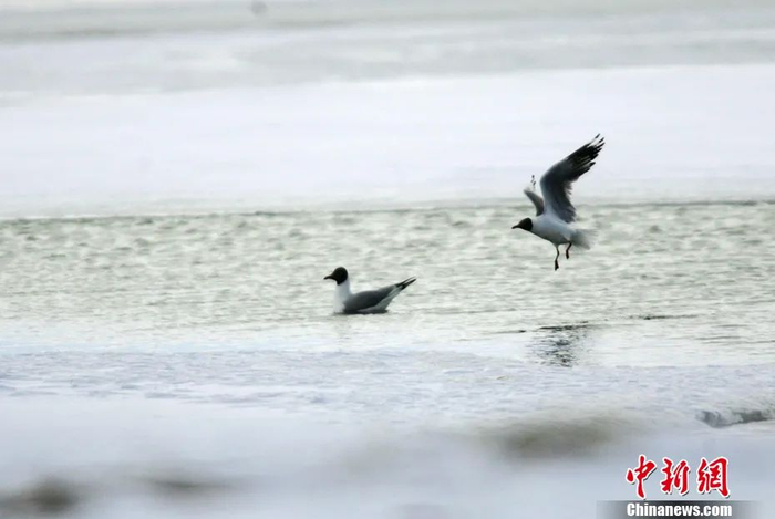 两只灰雁在可可西里无人区的冰河中嬉戏 武仲林 摄