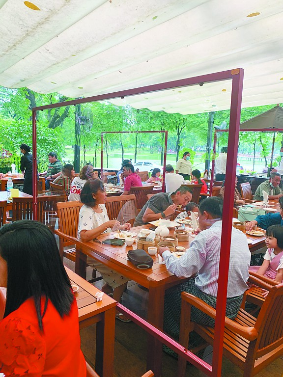 当然,放松管控并不是完全自由,而是松紧有度。在仰光各大商场、写字楼的门口,均设有专人测量体温,摆放警示牌提醒人们注意洗手消毒,保持距离,并佩戴口罩。而在各大餐馆,店家则遵照政府要求扩大了餐桌之间的间距,还摆放了专门的隔离装置,比如在餐桌上加装了塑料或者玻璃的隔离板,餐桌之间加了小型隔离屏风(如图),这个隔离屏风的制作也是“丰俭由人”,财大气粗的店家安装的是玻璃屏风,普通商家则是用塑料薄膜制成。虽然用料一般,但是隔离效果也不错,由此完全可以体会到商家为了防疫隔离确实动了不少脑筋。在设置隔离措施的火锅餐厅吃饭,记者是“大姑娘上轿头一回”,感觉十分有趣。一张小小的餐桌,被一道透明塑料隔板一分为二,记者和朋友面前各放一个小火锅,不断地冒着的热气,给隔板罩上了一层水雾,双方交流起来就像“雾里看花”,带有“朦胧之美”。最别扭的就是夹菜,每次都要“翻山越岭”绕过隔板,这一顿火锅吃下来满身是汗,除了热,当然还有累。