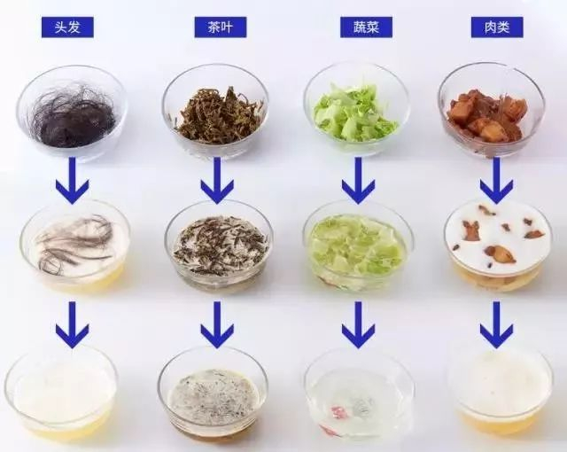 从左往右依次是:PVC塑料管、猪肉、青菜叶、毛发,分别加入疏通剂,一段时间后,可以看到PVC塑料管道完好无损,而其他实验物均被分解~