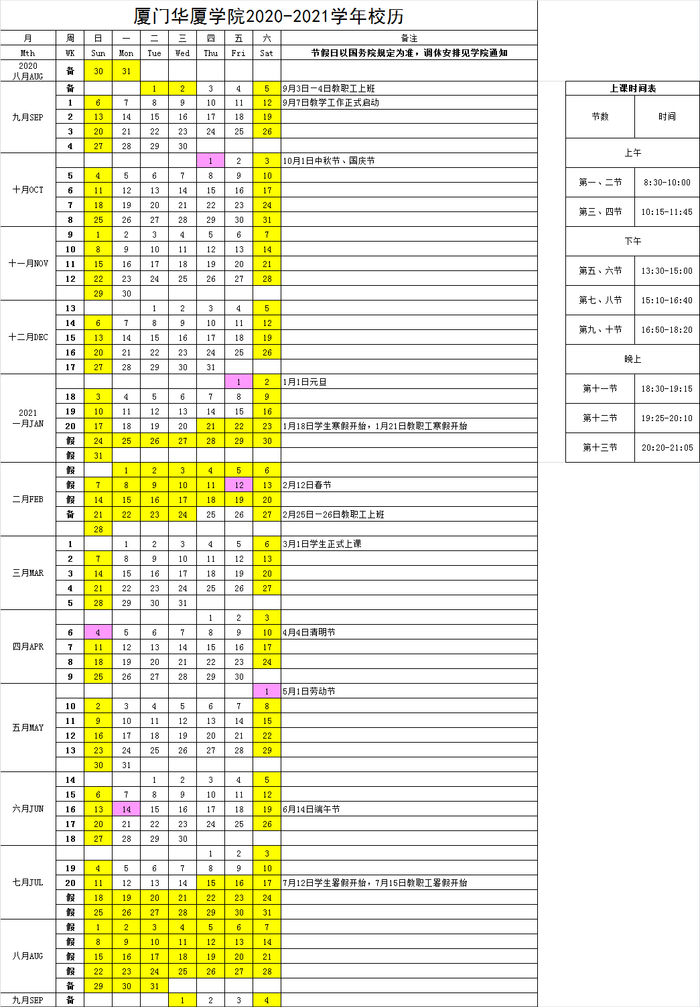 1.第一学期(共18周):2020年9月13日至2021年1月16日。2.注册日期:2020年9月13日 (二至五年级本科生和研究生)。3.上课日期:2020年9月14日。