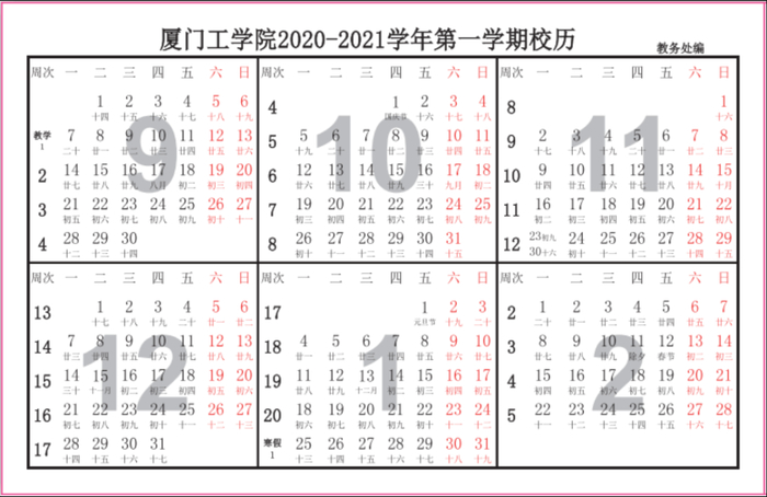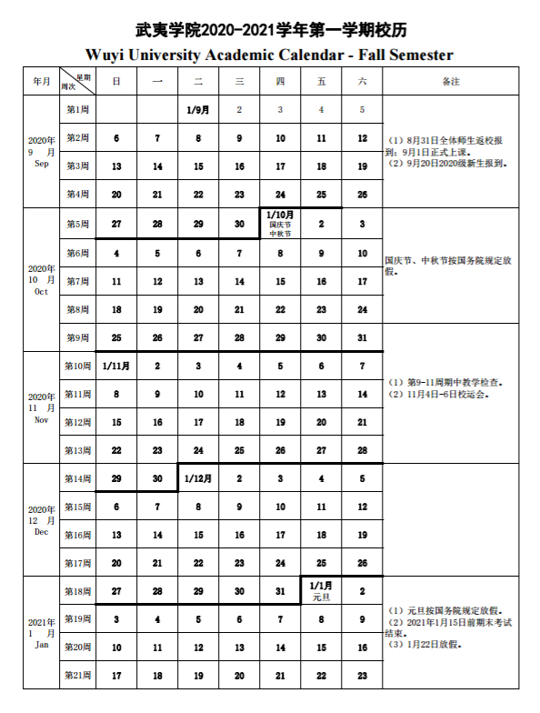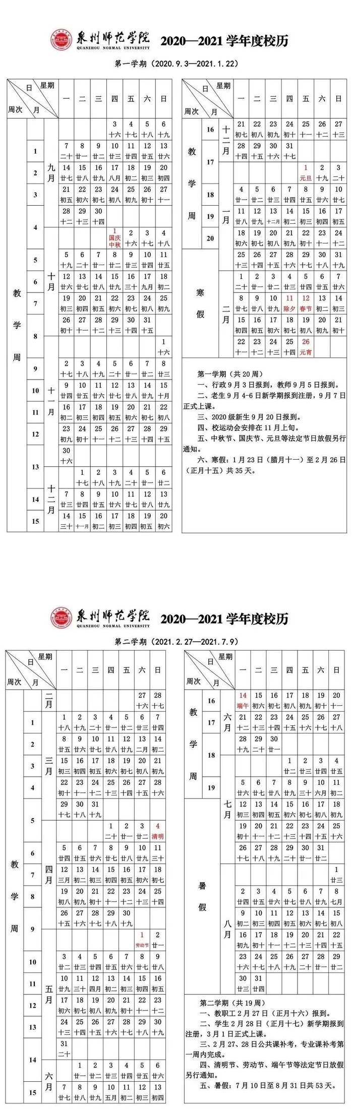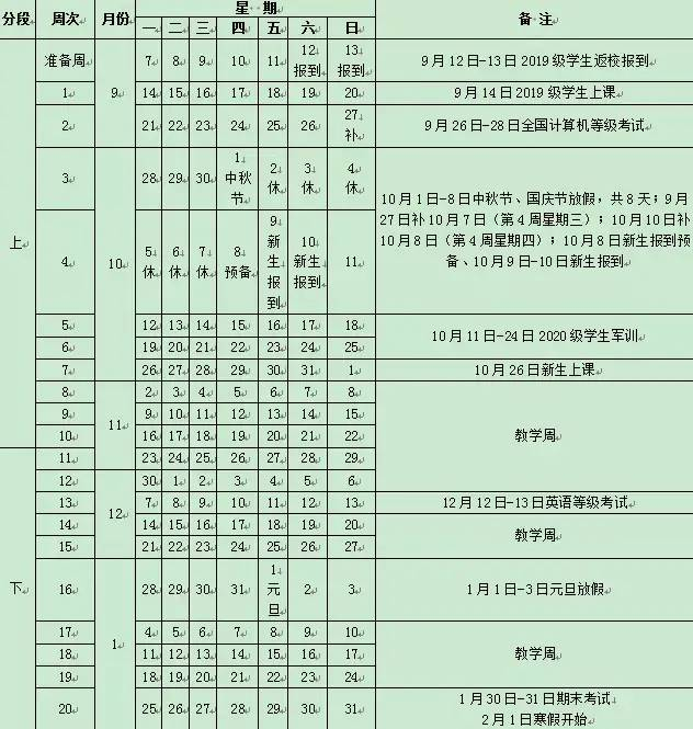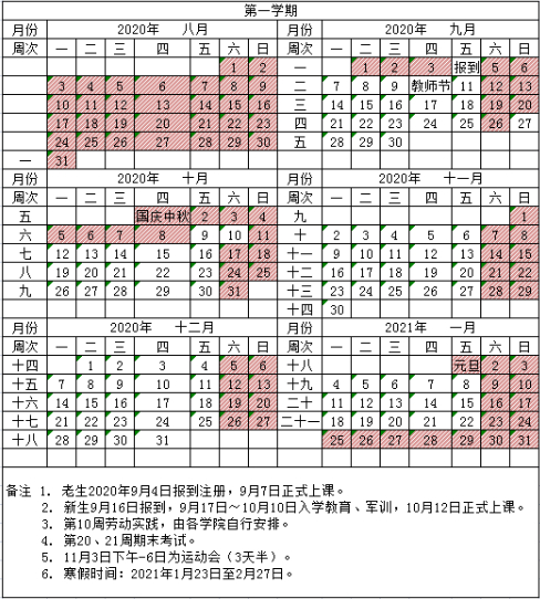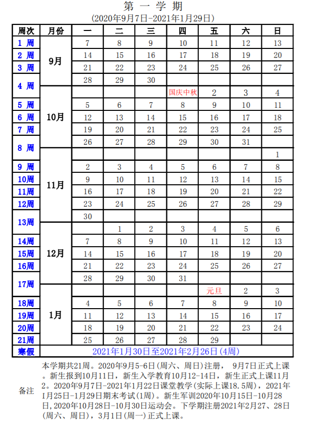 本学期共21周。2020年9月5- 6日(周六、周日)注册,9月7日 正式上课。新生报到10月11日,新生入学教育10月12-14日。