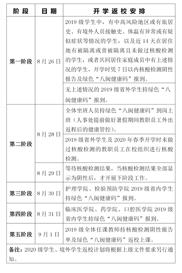 全体师生员工:根据福州大学2020年秋季学期返校开学工作安排,符合学校疫情防控条件的全日制本科生、研究生定于8月23日起分期分批错峰返校。