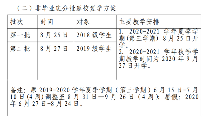 (三)老生8月18日(星期二)起分批错峰返校复课,新生9月20日(星期日)起分批错峰报到,返校复课及报到方案另行通知。