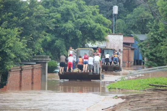 8月18日上午5时,地处岷江和马边河山谷地带的中国电建建筑公司西南指挥部西部方向第四项目部,在得知项目附近的犍为村仍有500多名村民被困时,全体人员紧急组成抢险突击队,拿出项目早已备好的救援物资、生活补给发放给百姓 ,出动项目装载机、挖机等机械设备协助部队官兵转移受困百姓。最终,在洪峰来临前20分钟,将所有村民安全转移到目的地。