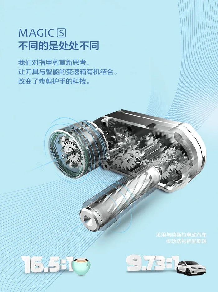 这个小小智能马达变速箱采用与特斯拉电动汽车传动结构相同原理,大大提升了爱魔电动指甲刀的性能,让它优于世面其他“磨”指甲的电动指甲刀~