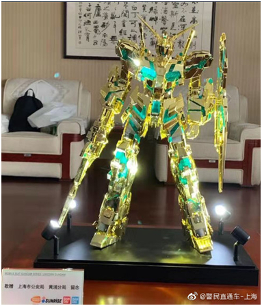 2019年在上海警方破获手办制假案后,日本万代公司赠送的限量版电镀金色高达模型