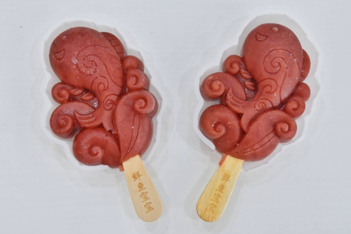 红色的“鲜鱼宝宝”冰棍则是传统的“大红果”口味,京城有名的胡同鲜鱼口美食街上画有鲤鱼图案的井盖,给了设计师做卡通鱼的灵感。冰棍通体颜色鲜红、形状饱满,两侧卷起水波纹簇拥着萌萌的大头鲤鱼,显得活灵活现。两种冰棍售价都是15元一支。让设计师和店里工作人员没想到的是,冰棍第一天上市就受到许多食客的欢迎。
