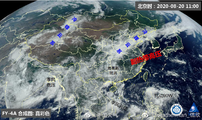 从卫星云图看,值得关注的是在菲律宾以东的洋面上有热带扰动发展,这个扰动有可能加强成台风“巴威” ,大家还要留意临近预报。