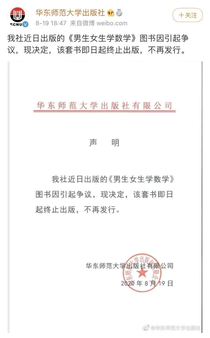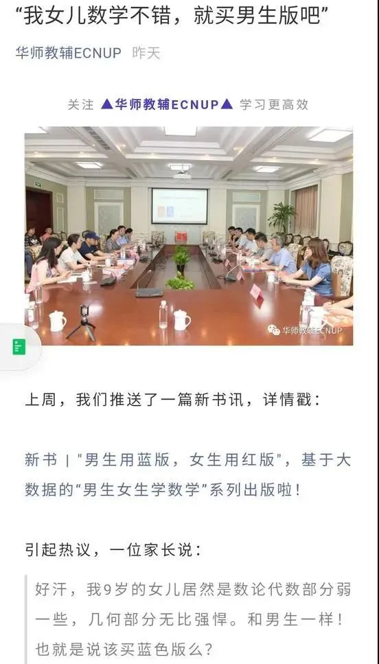 与这一说法对应的是,该出版社公众号文章的大标题赫然使用了一位家长的原话:“我女儿数学不错,就买男生版吧。”