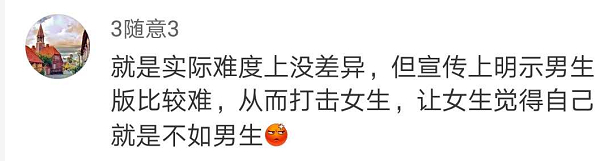 虽然文章提醒到:“男生建议用蓝版,是不是意味着蓝版更难一点,红版更简单?实际并不是这样,总体难度应当差不多,只是部分章节内容有差异。”但是,男生数学能力强于女生的信息仍然夺人眼球,令人倍感矛盾。
