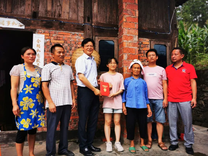 2020年高考成绩发布后,陈立群(右一)走村串寨送喜报。这个习惯他已坚持了四年。(台江民中供图)
