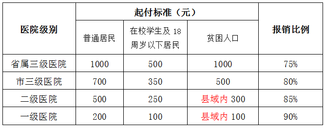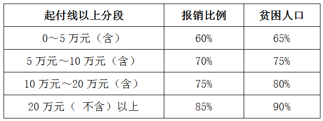 起付线:1.5万元。贫困人口在省内就医起付线为0.75万元,分段报销比例分别提高5%。