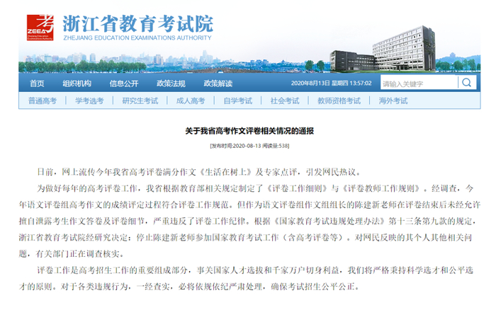 后经浙江省教育考试院调查,语文评卷组高考作文的成绩评定过程符合评卷工作规范。但作为语文评卷组作文组组长的陈建新老师在评卷结束后,未经允许擅自泄露考生作文答卷及评卷细节,严重违反了评卷工作纪律。