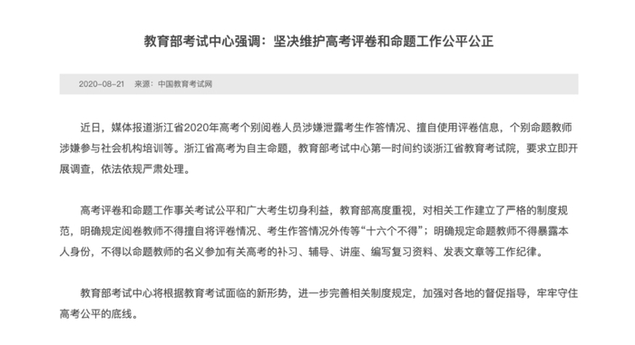 据教育部网站消息,近日,媒体报道浙江省2020年高考个别阅卷人员涉嫌泄露考生作答情况、擅自使用评卷信息,个别命题教师涉嫌参与社会机构培训等。浙江省高考为自主命题,教育部考试中心第一时间约谈浙江省教育考试院,要求立即开展调查,依法依规严肃处理。