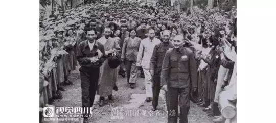 1951年4月,邓小平和各界群众欢迎以阿沛·阿旺晋美(前左一)为首的西藏地方政府代表团途经四川前往北京。