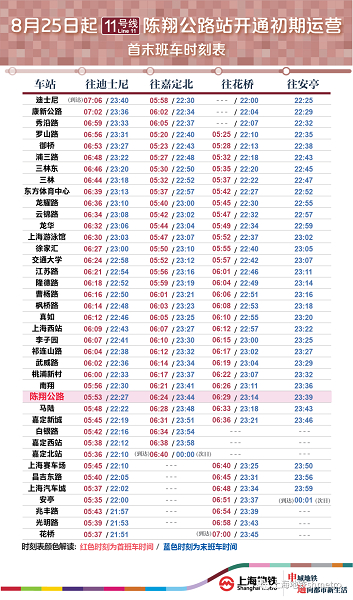 8月25日起,11号线陈翔公路站载客试运营,该站往迪士尼站首班车时间5:53、末班车时间22:27;往嘉定北站首班车时间6:24、末班车时间23:44;往花桥站首班车时间6:29、末班车时间23:14、往安亭站末班车时间23:39。