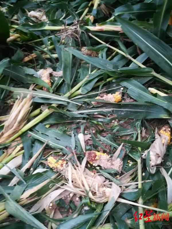 在杨某春发来的图片中,红星新闻记者看到一片玉米地被糟蹋,掉在地上的玉米棒子被动物啃食过。另有图片显示,地里有多个动物的脚印。