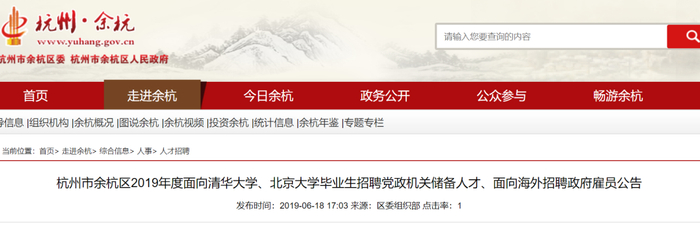 每经小编注意到,2018年余杭区分两批开展了面向清华大学、北京大学硕研以上毕业生专场招聘党政机关储备人才工作。