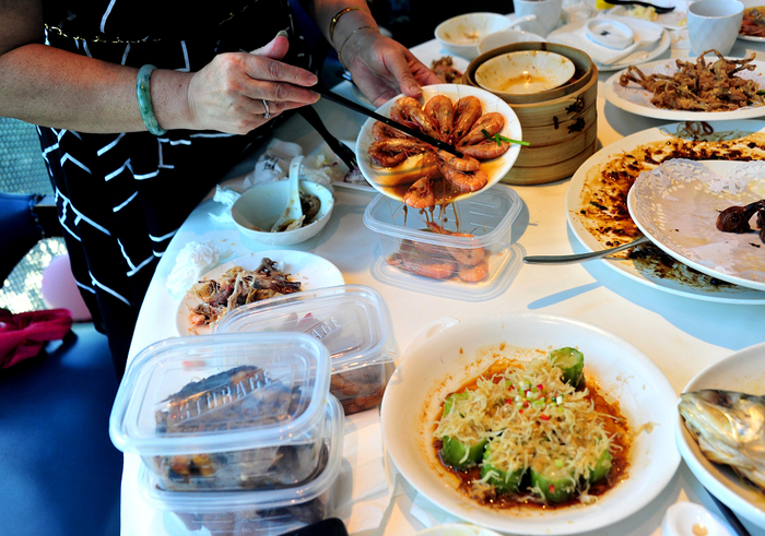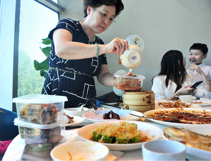 徐汇滨江的一家饭店里,一位女士正在将餐宴后没吃完的菜肴一一装盒打包带回家。杨建正 摄(下同)
