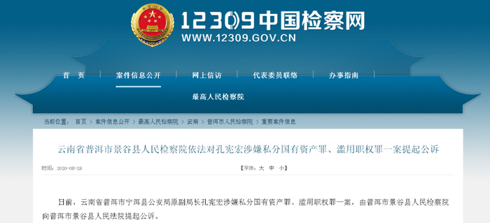 日前,云南省普洱市宁洱县公安局原副局长孔宪宏涉嫌私分国有资产罪、滥用职权罪一案,由普洱市景谷县人民检察院向普洱市景谷县人民法院提起公诉。