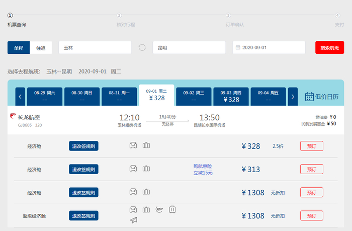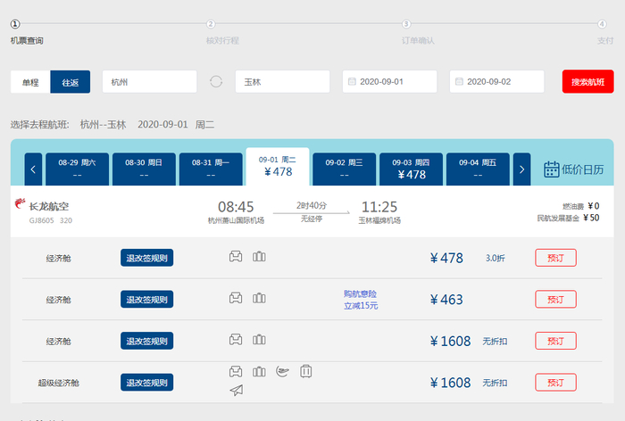 玉林-杭州8月29日已显示票价,但暂时无法预定;9月1日已显示票价(558元)及航班信息并可在线预定;玉林-昆明9月1日航班已显示票价(328元)及可在线预定。