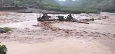 一辆采砂船被冲到下游后搁浅河中心