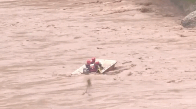 湍急的水流将3名救援人员