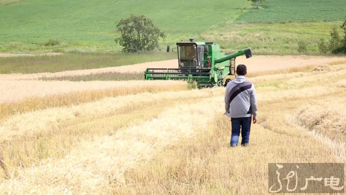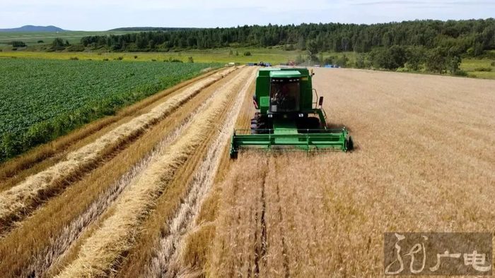 在黑河市爱辉区罕达汽镇的一片麦田中,金色麦穗正随着秋风低头摇摆,一台联合收割机只需6个小时就可以将这片麦田全部收割完毕。