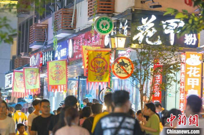 8月22日晚,恰逢周六,在江西省赣州市章贡区的鱼湾里美食街,各色美食飘香四溢,街上人群摩肩接踵,好不热闹。鱼湾里美食街于2018年10月正式开业,其前身是赣州市一个又脏又乱的城中村,道路狭小、房屋破旧。经过政府的统一规划改造,成为如今富有特色、环境整洁的美食街。在这里可以吃到赣南18个县(市区)以及全国各地的美食。 刘力鑫 摄