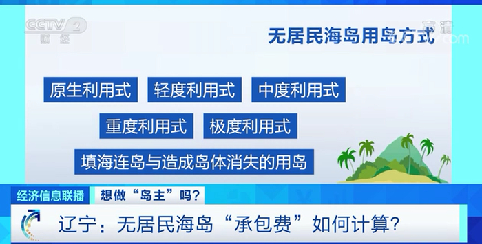 大连海洋大学教授 田涛:以网友们热议的,最低等级的第六等级无居民岛为例,如果是原生利用,每年只需缴纳3700元/公顷的使用金,一旦达到重度利用或极重度利用,出让金价格就会飙升13到20倍左右,最严重甚至填海连岛这种出让金,更是高达927万元/公顷。所以这个标准是非常高的,它的制定也是非常严格的,实际上原则非常明显,就是要鼓励生态保护而非经济开发。