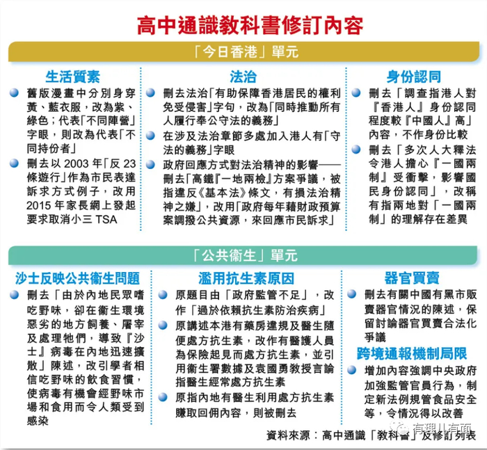 据悉,此次修订后的通识教材中,以“今日香港”单元修改最为明显,该单元是香港高中通识教育六大单元之一,涵盖有关香港法治的议题内容。