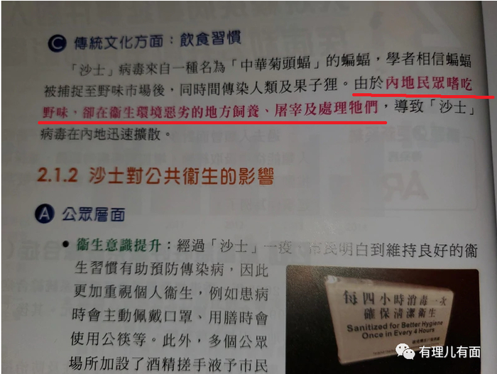 如在公共卫生单元,就修订了多项涉及内地的不实描述,如在讨论“SARS”反映的公共卫生问题时,旧版称“内地人嗜吃野味,却在卫生环境恶劣的地方饲养、屠宰它们,使SARS在内地迅速传播”,修订后则删去有关陈述,改引用学者称其相信吃野味的饮食习惯,使病毒有机会经野味市场和食用而令人类受到感染。