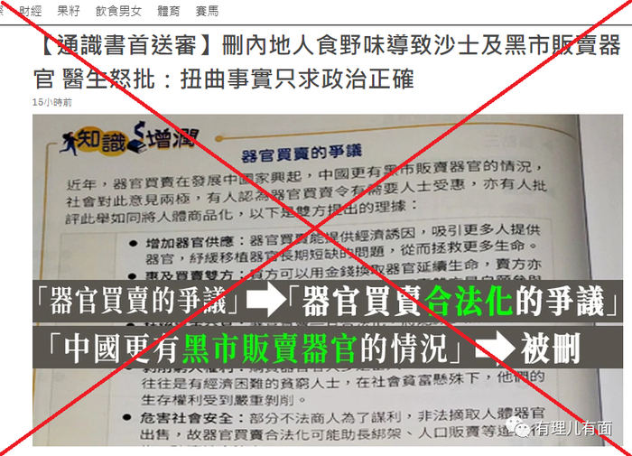 再如抹黑内地有黑市贩卖器官的内容,在此次修订时也被删除。