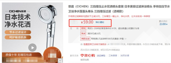 这么大受好评的加压、细软流、带滤芯的花洒,官方价格肯定很贵,果不其然查了下:59元。