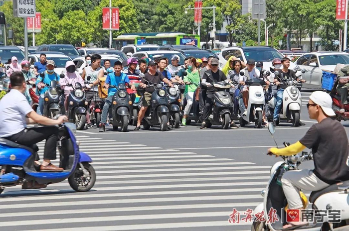 连日来,记者走访南宁市几个车流量密集的路口,了解下最新的情况。8月20日晚高峰,记者来到民族大道七岔路口,因正值下班时间,电动自行车大军规模巨大,每一拨红绿灯等候期间,路口都聚集了大量的车流。