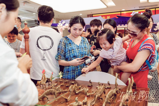 在传统文创互动区,消费者可以近距离了解街道葫芦烙画、棕编、编织等传统手工艺品,也能进一步了解明止堂、华亭挑花、学宫狮等富有嘉定地方特色的文创产品。七夕文化快闪集市上还展出了非遗和民间艺人的作品。赵女士带着女儿在文创互动区流连忘返,她说,平时都是在百联逛街吃饭,今天则是享受了一顿“文化盛宴”,“我们在现场体验了古砖拓印,了解了古代字砖的历史,好玩又有趣,受益匪浅。孩子也是第一次了解乞巧的含义。”