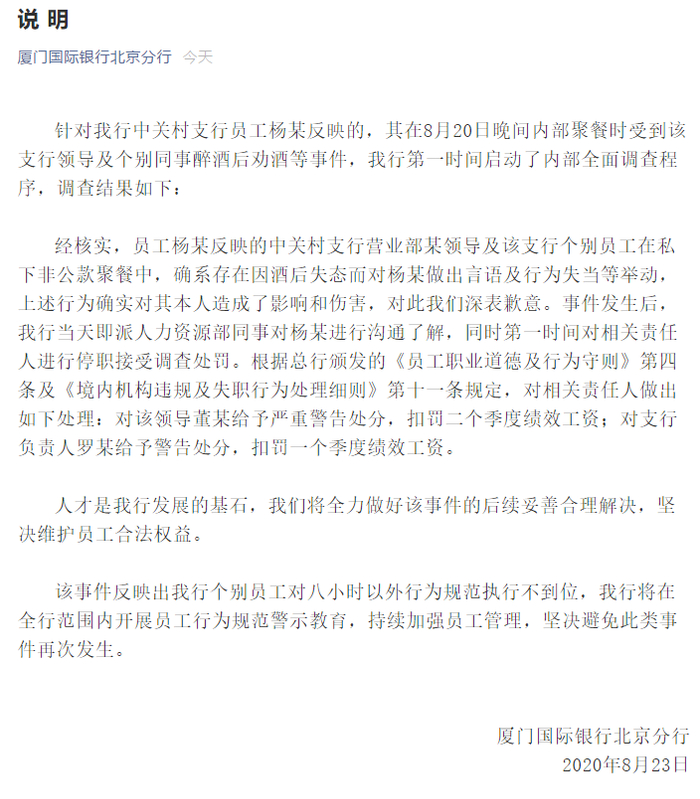 就在该员工发布的“劝酒事件”后续说明约半小时后,厦门国际银行北京分行通过其官方微信平台发布了公开说明,称确系存在员工在酒后失态当事人作出对杨某言语及行为失当等举动,已第一时间对相关责任人进行停职处罚并处以罚款警示。