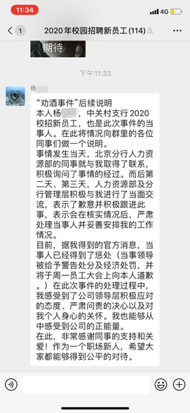 就在“吃瓜群众”纷纷热议该事件时,该当事员工于8月23日晚间23:33突然在原爆料的群里发布“劝酒事件”后续说明,回应截图如下: