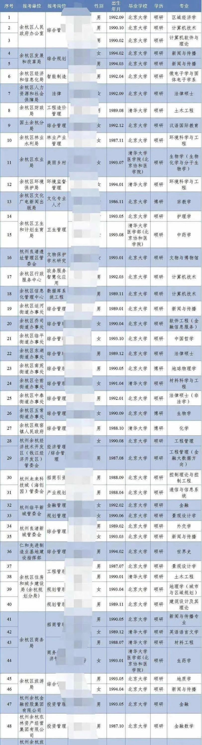 近日,一张杭州余杭区招聘公示的截图引发网友关注。这份长长的公示名单里,清一色是来自清华、北大的毕业生,其中还包括一些街道办事处的岗位。
