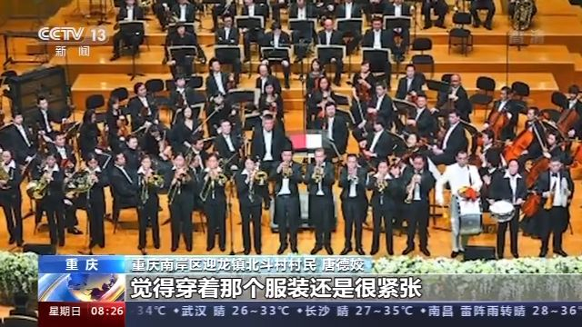 重庆市南岸区迎龙镇北斗村村民 唐德姣:我还是第一次穿(礼服),觉得穿着那个服装还是很紧张。演完后听到下面的掌声,我们感觉很幸福、很有荣誉感。