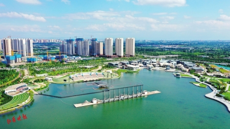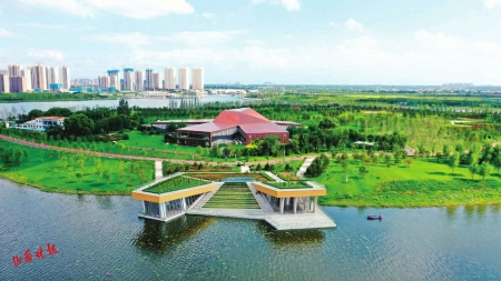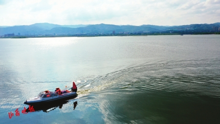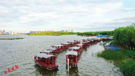 8月20日,近期连绵多雨的太原迎来短暂的晴好天气。晋阳湖公园天蓝水碧,湖中水波荡漾、涛声阵阵,岸边绿树成荫、鸟语花香。