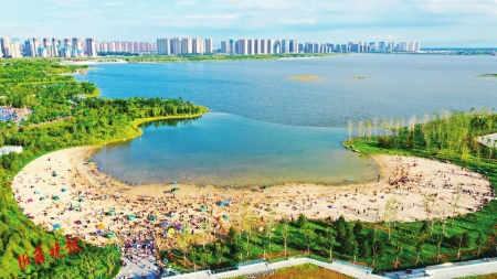 虽然不是周末,但在东岸的音乐喷泉广场、北岸的儿童活动区、西岸的沙滩浴场,还是迎来了众多游客。玩沙、戏水、游乐场永远是孩童的最爱,童真的笑声足以让他们流连忘返。而大人们在岸边或健身或漫步,在碧水蓝天之间享受着难得的悠闲与惬意。在游人相对较少的西南岸,时不时有一对对青年男女相互依偎窃窃私语,也有一些商务人士陪着客户漫步林中探讨着生意上的点点滴滴……