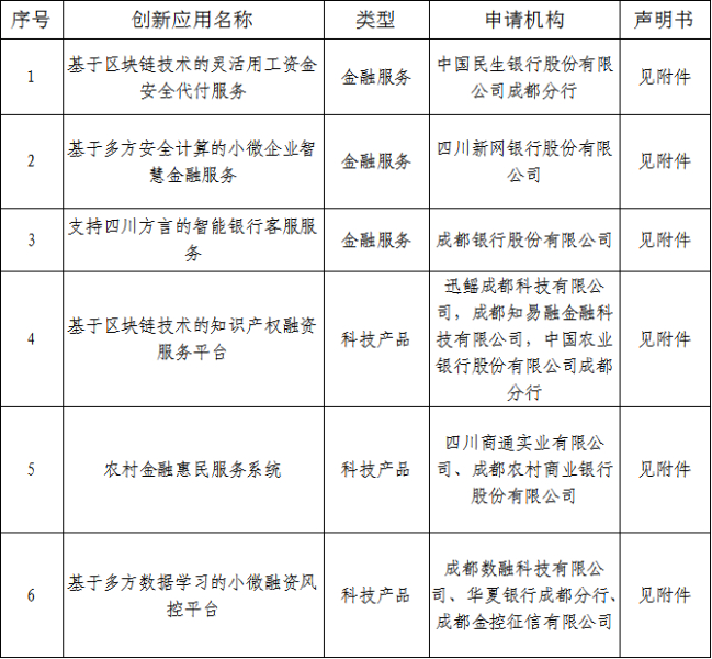 从申请机构来看,成都监管沙盒创新应用申请机构包括国有大行、全国性股份航、民营银行、中小银行、征信机构、科技公司等。从产品类型来看,6项应用中,3项为金融服务、3项为科技产品。从技术使用上看,6项创新应用中有3项涉及大数据技术,有3项涉及区块链技术。从应用目的看,有4项项目的目的是为解决小微、三农融资问题。