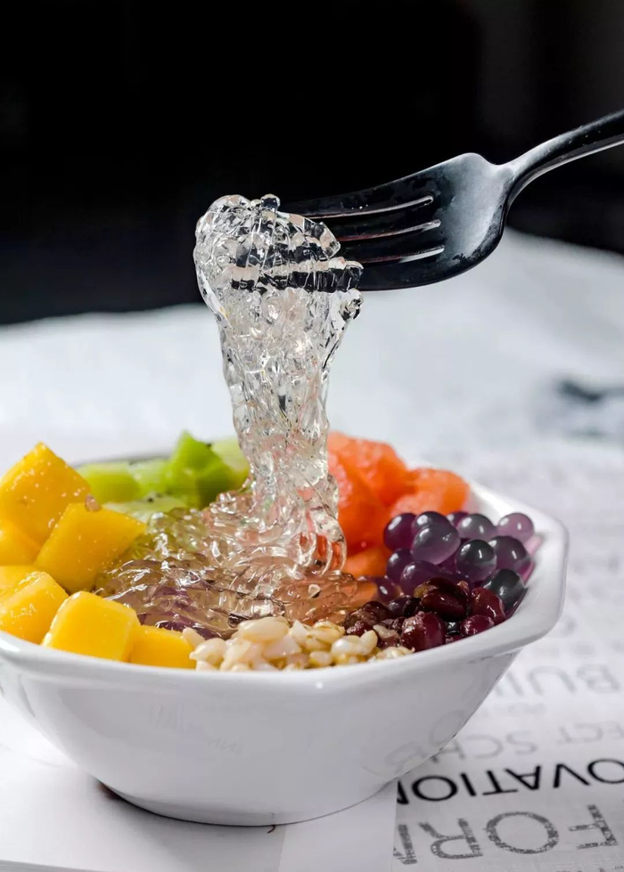 将海藻经过繁杂的工序熬煮出胶,等到凝固之后,就成了晶莹剔透、口感Q弹的海石花。