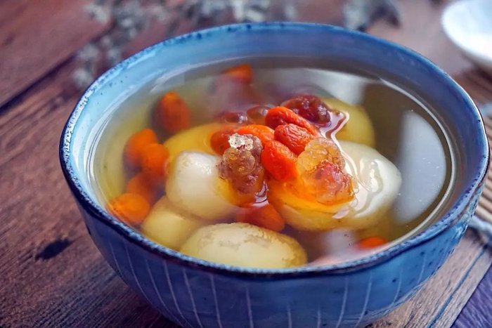在潮汕吃鸭母捻,一般会做成一道甜汤,这碗汤里面还会有鹌鹑蛋、银耳、莲子、百合、白果,丰富程度先甩开其他单枪匹马的团子一截。