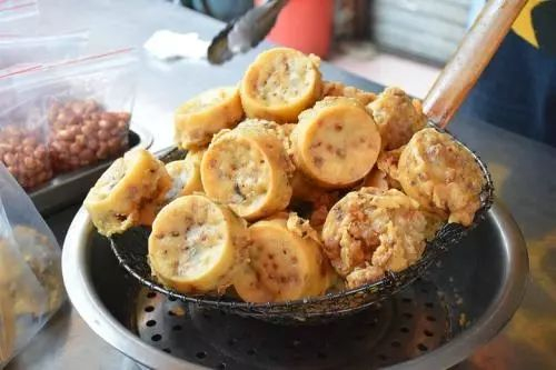 猪脚圈是潮汕的特色油炸小吃,里面包裹的可能是芋头、萝卜丝,或者是番薯、花生等等。