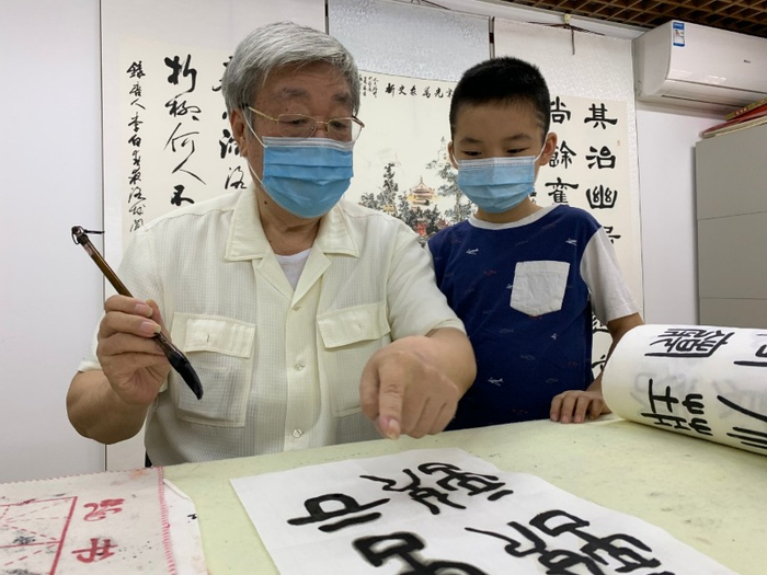 从2017年起,退休在家的张鸿林“入职”社区书房,手把手教社区居民和孩子们进行书法练习。