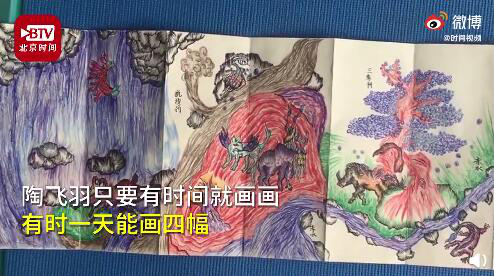 近日,重庆10岁的陶飞羽暑期萌发了绘画《山海经》故事的想法。妈妈介绍,陶飞羽画《山海经》几近“疯狂”,20多天先后画了36幅,画卷长3.2米。除了画《山海经》的奇花异兽和奇特风貌,陶飞羽还尝试绘神话故事。